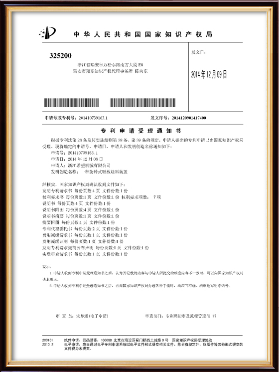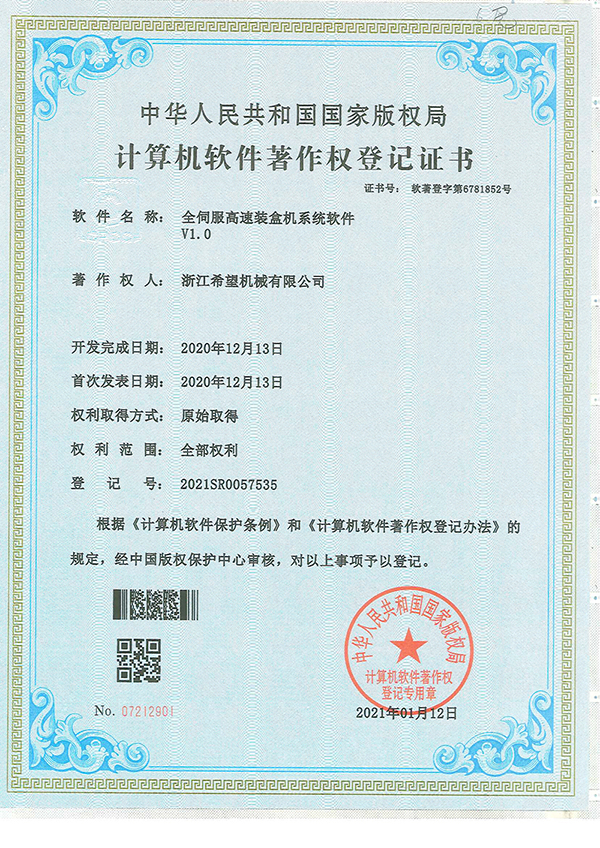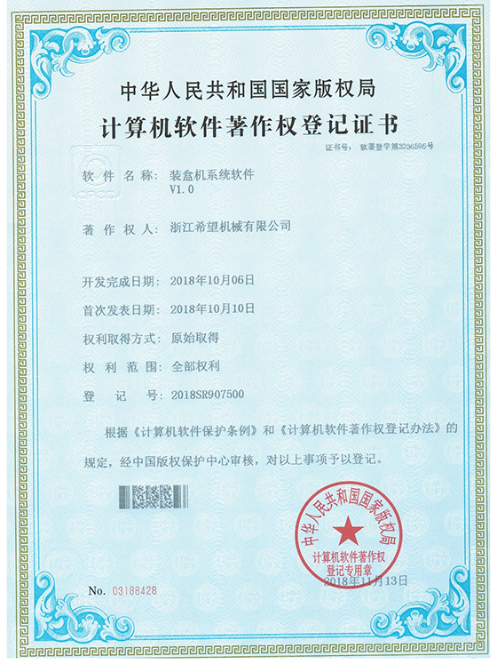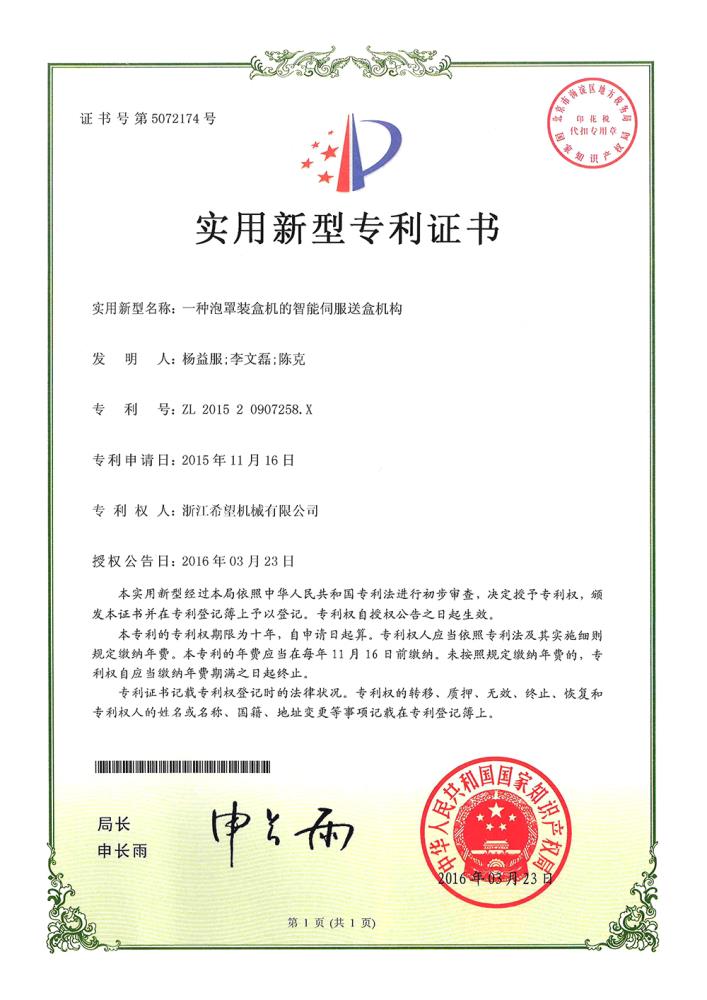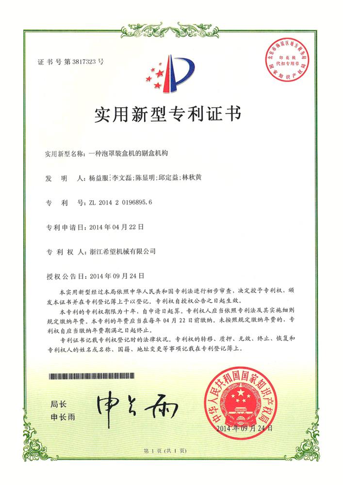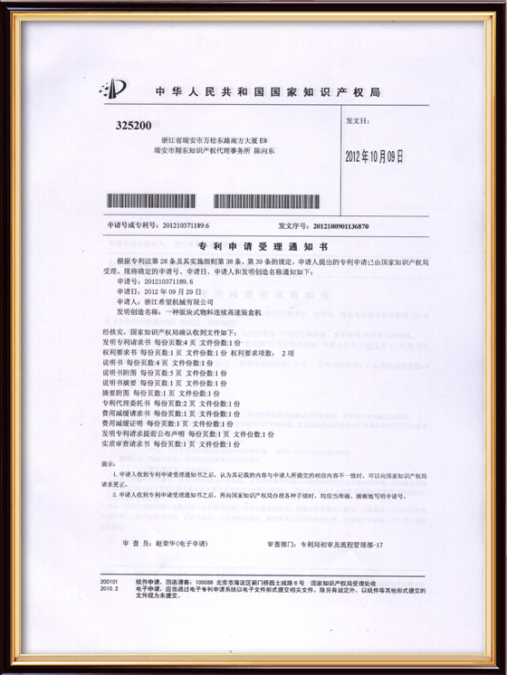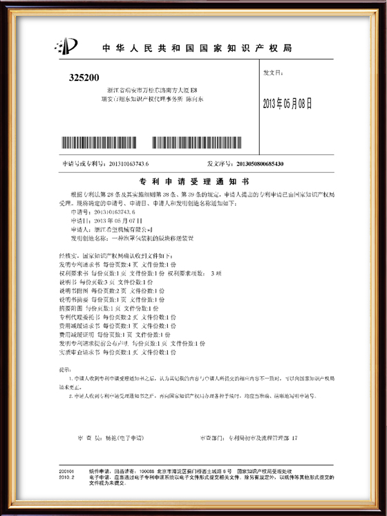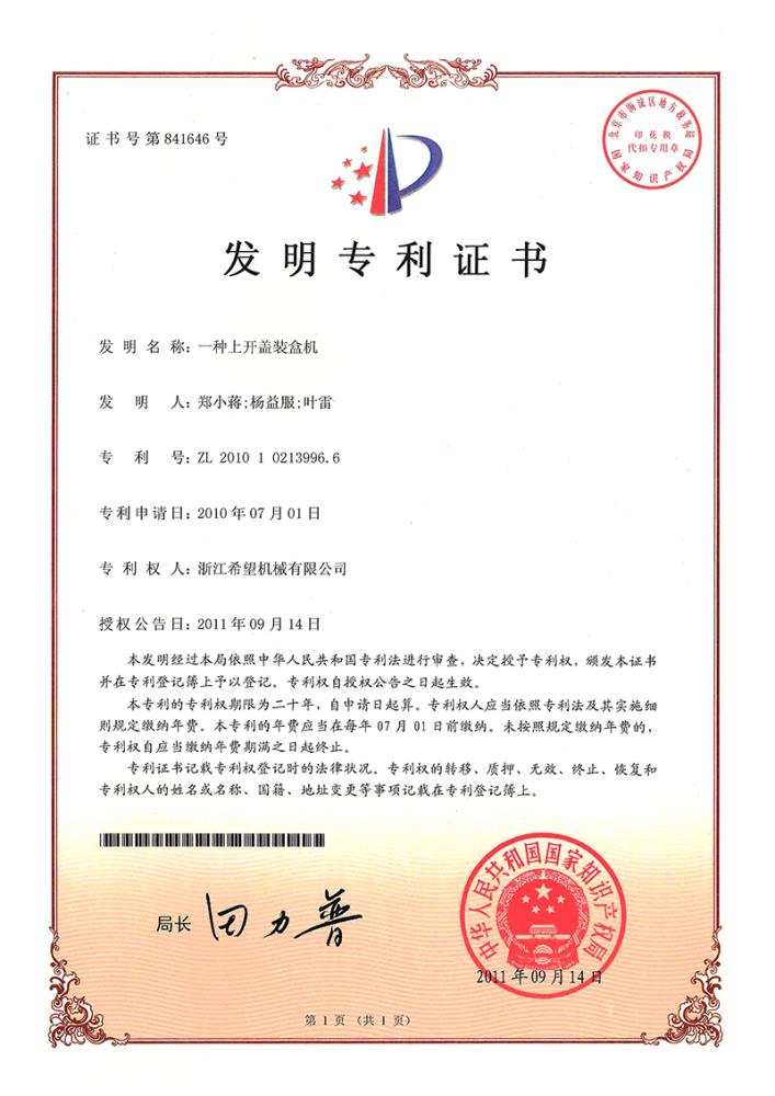 2011年9月14日,公司的“一種上開蓋裝盒機”獲得發(fā)明專利授權(quán),專利號為ZL01010213996.6。