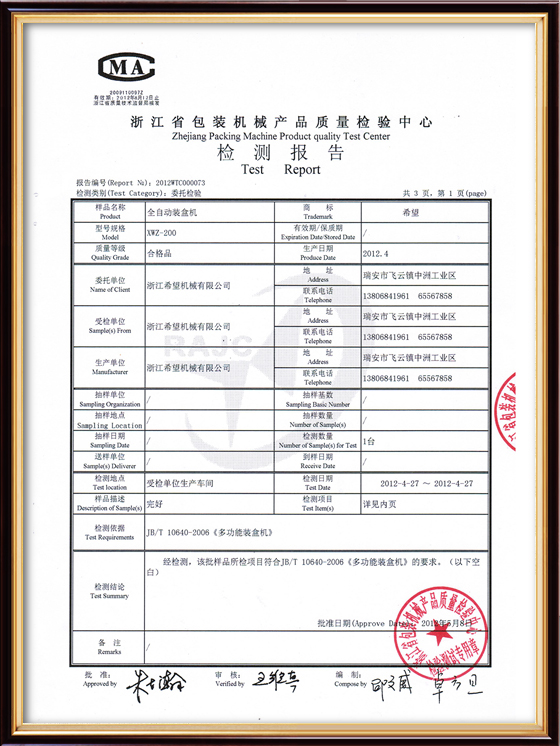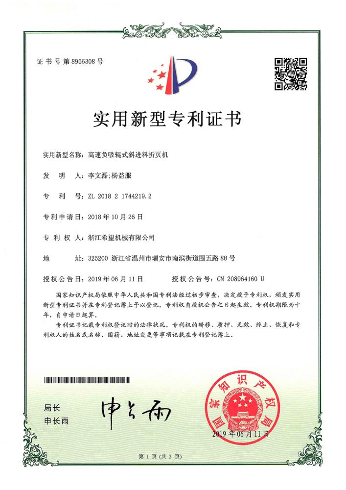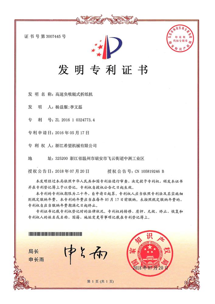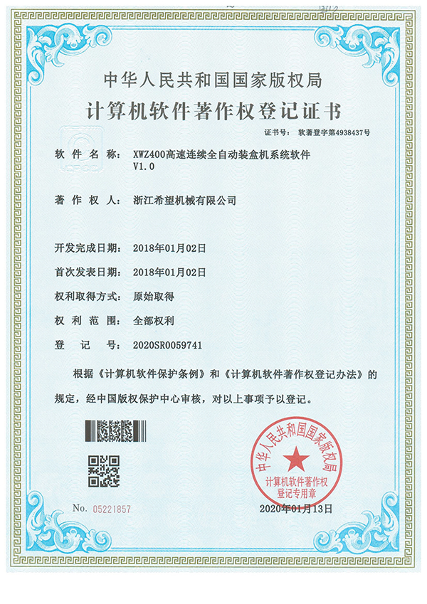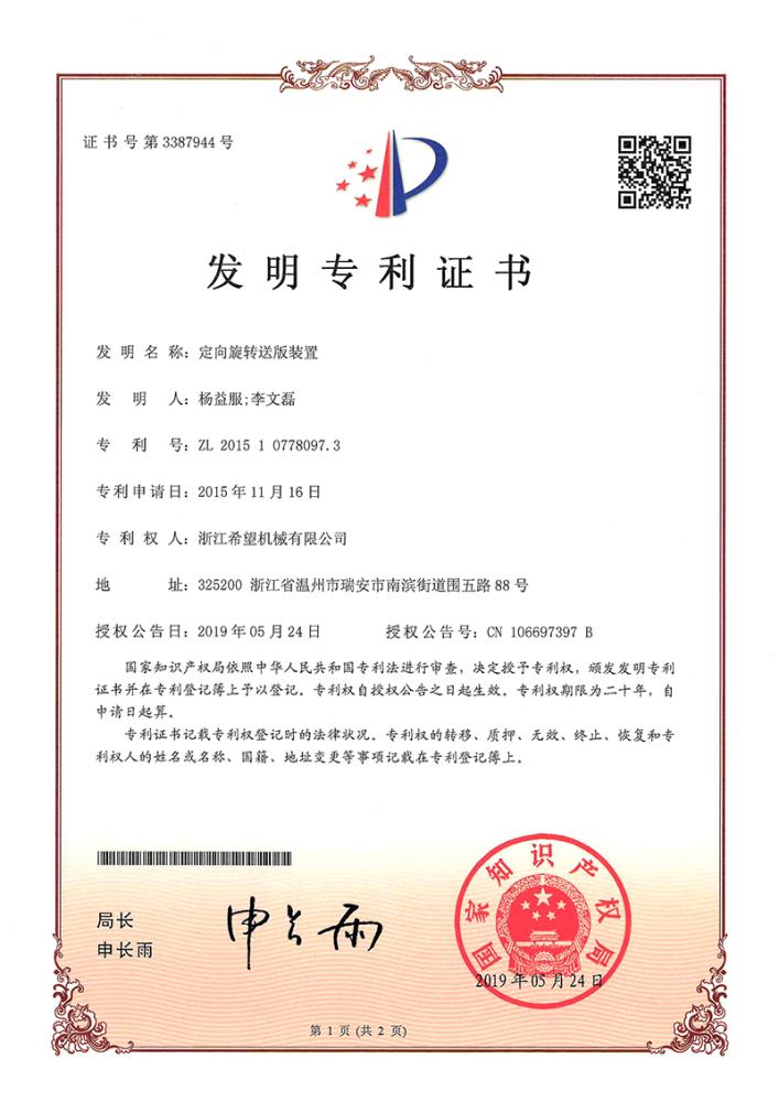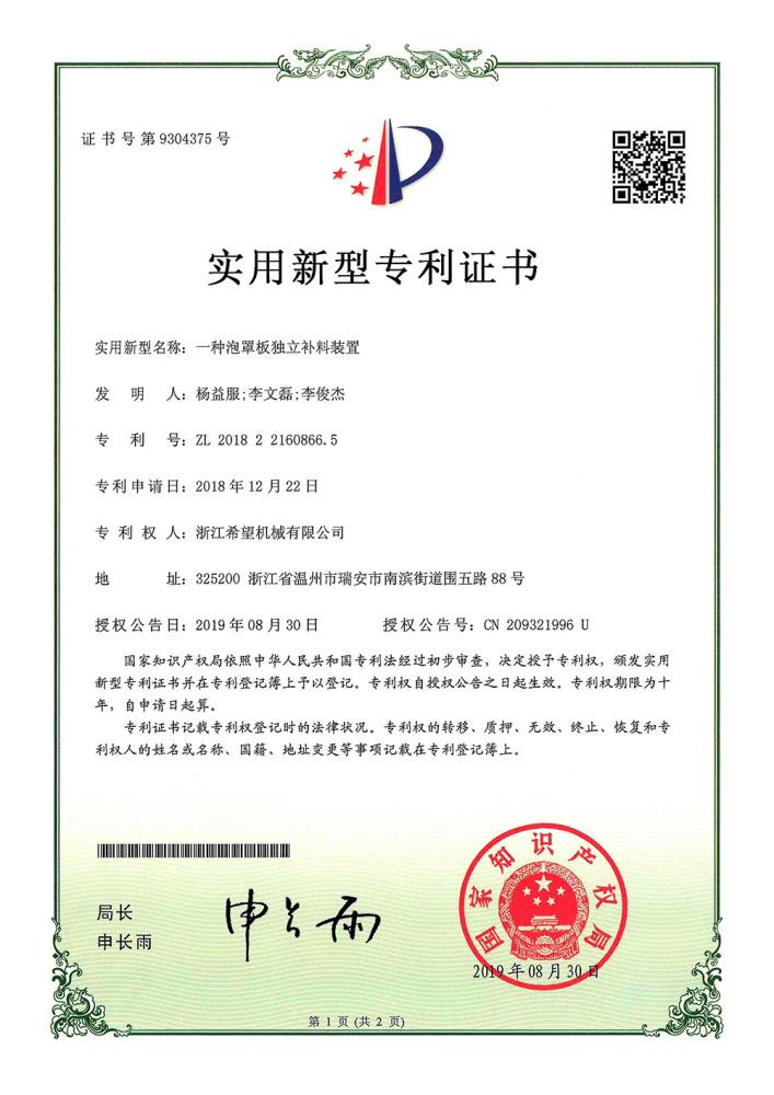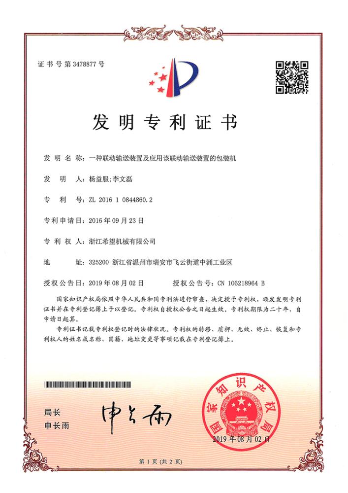 2011年9月14日,公司的“一種上開蓋裝盒機”獲得發(fā)明專利授權(quán),專利號為ZL01010213996.6。