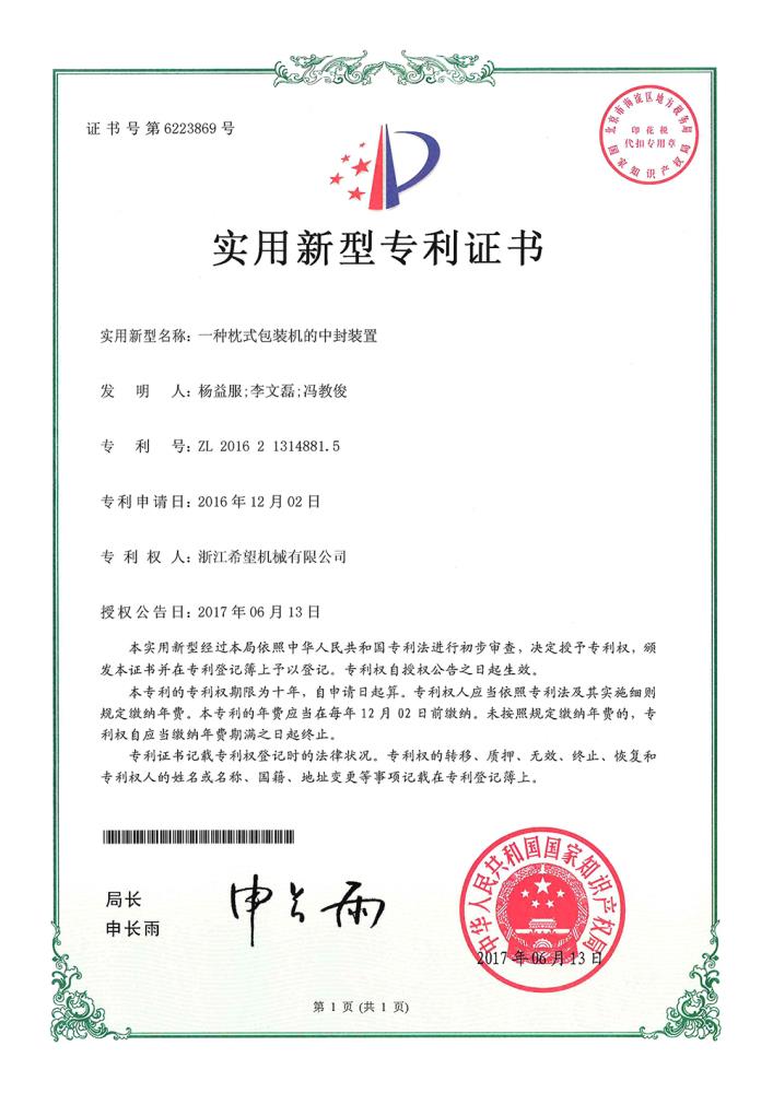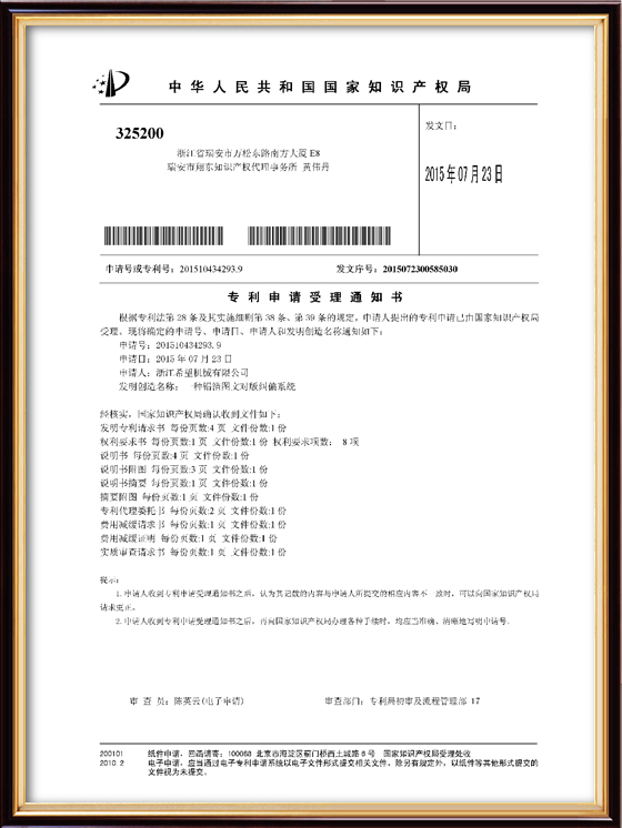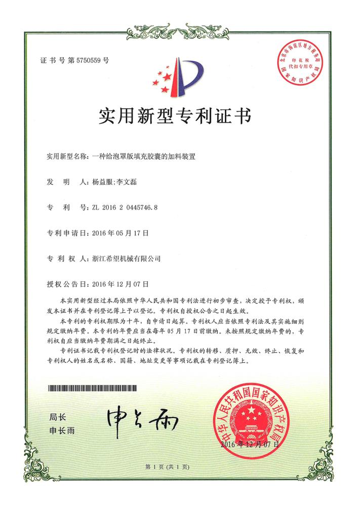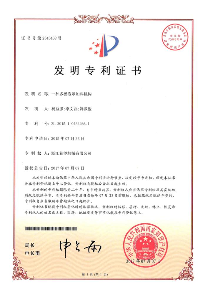 2017年7月7日,公司的“一種多板泡罩加料機構(gòu)”獲得發(fā)明專利授權(quán),專利號為ZL201510434266.1。