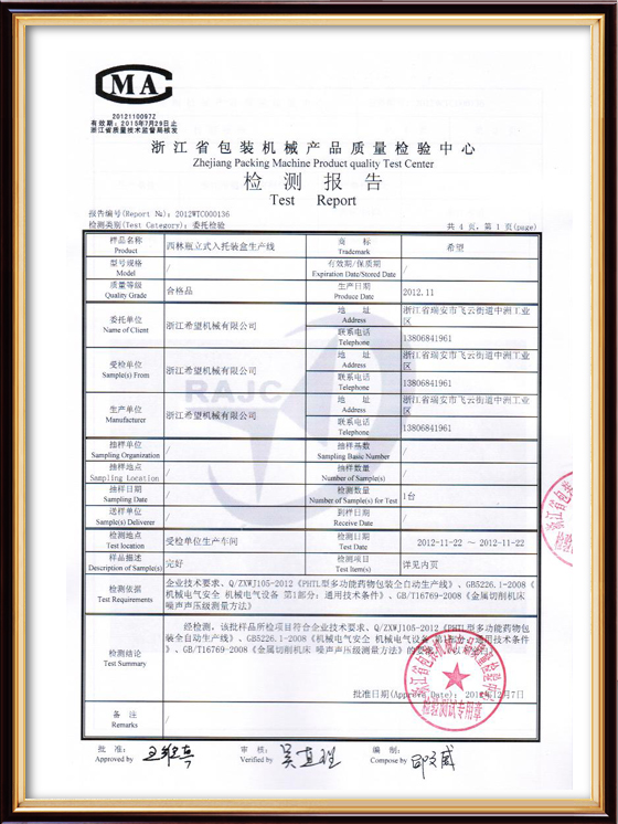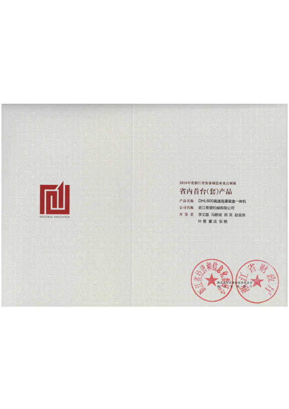 2016年“DHL600高速泡罩裝盒一體機”獲浙江省首臺套產(chǎn)品榮譽稱號。