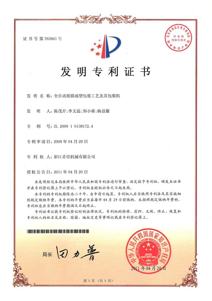 2011年4月20日,公司的“全自動面膜成型包裝工藝及其包裝機”獲得發(fā)明專利授權(quán),專利號為ZL200910138172.4。
