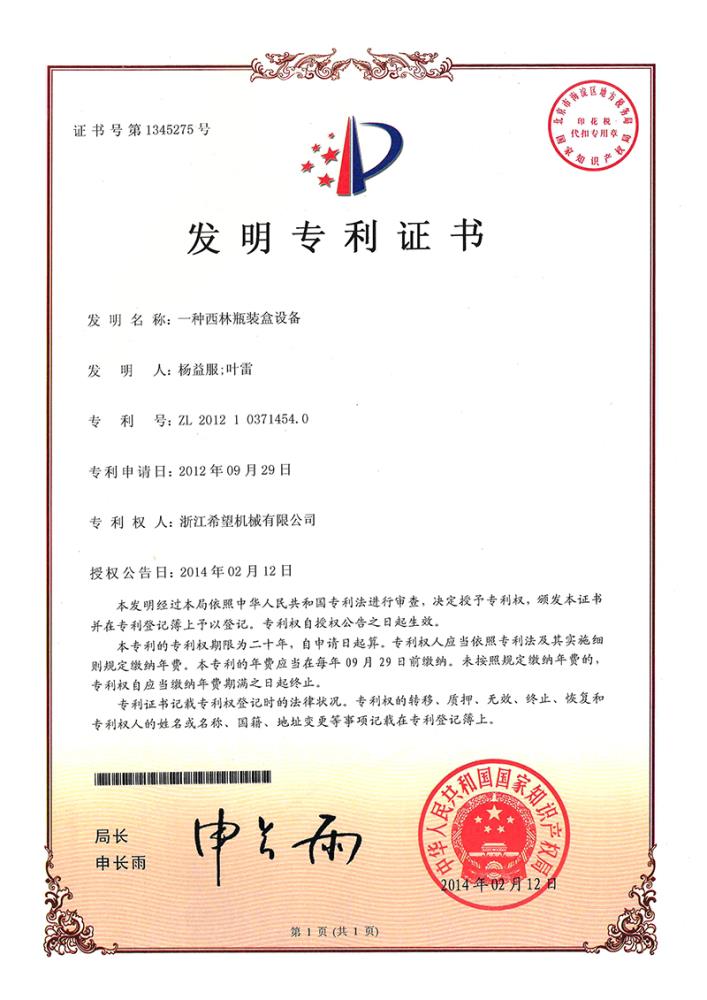 2014年2月12日,公司的“一種西林瓶裝盒設備”獲得發(fā)明專利授權(quán),專利號為ZL201210371454.0。