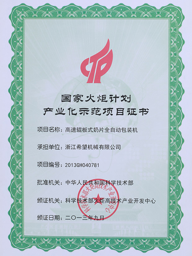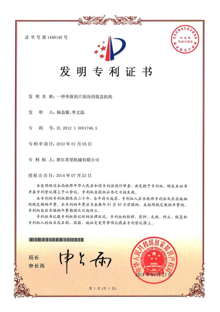 2014年7月23日,公司的“一種單版奶片版塊的裝盒機構(gòu)”獲得發(fā)明專利授權(quán),專利號為ZL201210001746.5。