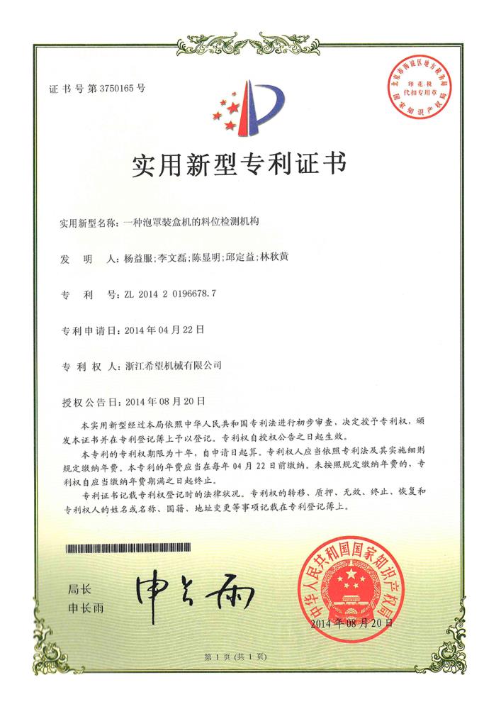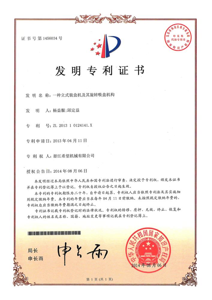 2014年8月6日,公司的“一種立式裝盒機及其旋轉(zhuǎn)吸盒機構(gòu)”獲得發(fā)明專利授權(quán),專利號為ZL201310124141.X。