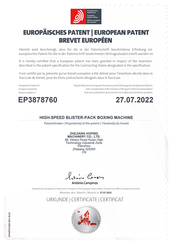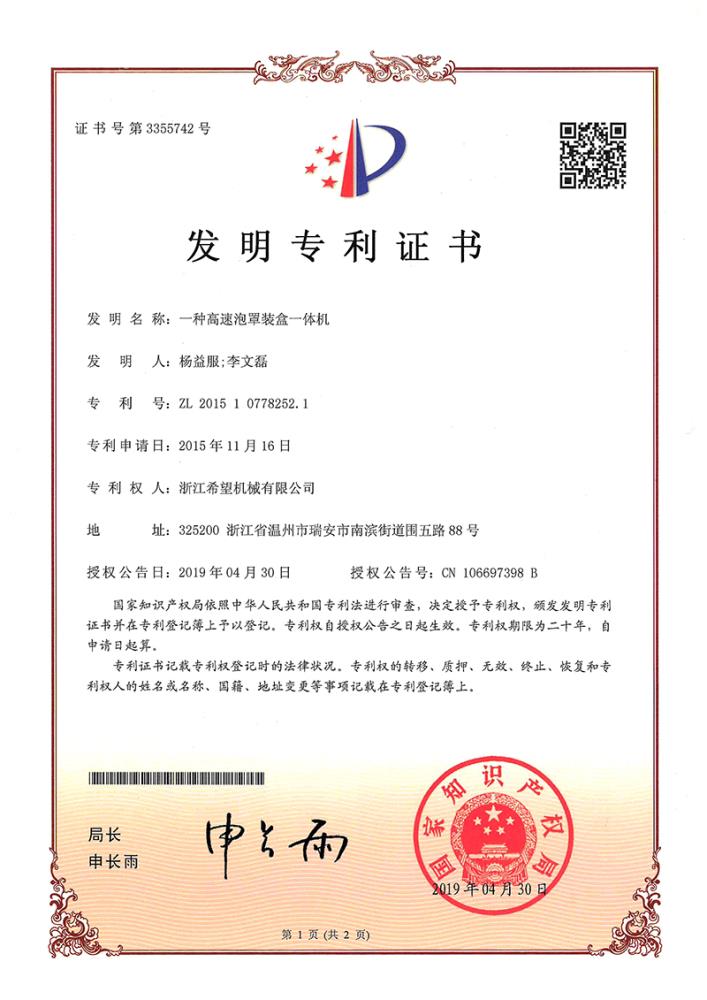 公司屬于國家專精特新小巨人企業(yè)。研發(fā)的多項包裝產(chǎn)品,填補了國內(nèi)空白,獲26項國家級發(fā)明專利,PCT國際專利10項,并通過國家權(quán)威機構(gòu)鑒定,符合新版GMP要求。作為中國藥品泡罩包裝一體機開創(chuàng)者,一體機產(chǎn)品獲國家國內(nèi)首臺套裝備、省重點新產(chǎn)品、浙江省首臺套產(chǎn)品、浙江省服務型制造示范企業(yè)、浙江省信用管理示范企業(yè)、省級研發(fā)中心、浙江省知識產(chǎn)權(quán)示范企業(yè)、AAA級 浙江省“守合同重信用”企業(yè)、 浙江省商業(yè)秘密保護基地示范點、溫州市科學技術(shù)二等獎、溫州市工業(yè)設計中心、溫州市智能制造示范企業(yè)、溫州市市級制造業(yè)“云上企業(yè)”、瑞安市領(lǐng)軍工業(yè)企業(yè)、瑞安市市長質(zhì)量獎、瑞安市無廢工廠等榮譽。
