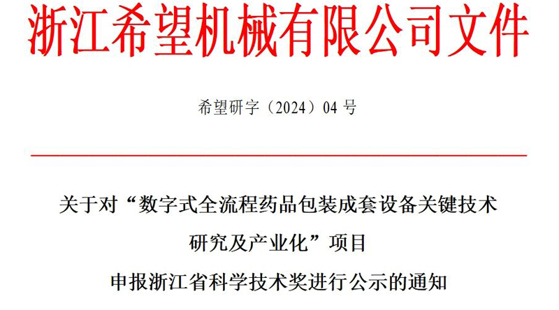 關(guān)于對(duì)“數(shù)字式全流程藥品包裝成套設(shè)備關(guān)鍵技術(shù)研究及產(chǎn)業(yè)化”項(xiàng)目 申報(bào)浙江省科學(xué)技術(shù)獎(jiǎng)進(jìn)行公示的通知